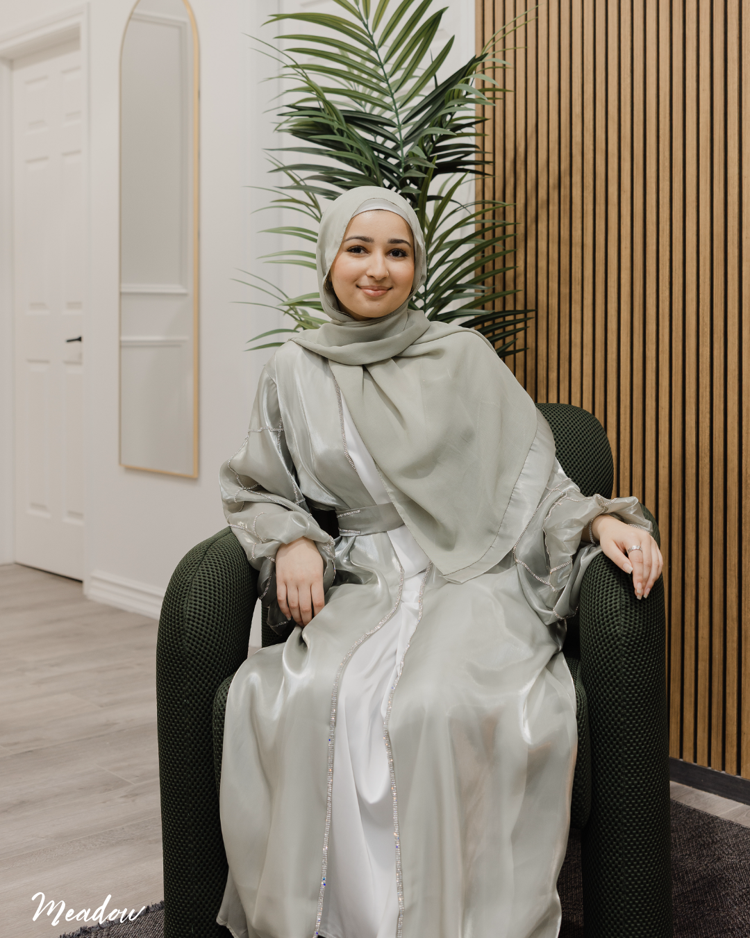 This beautiful 4-piece set combines flowing organza with rhinestone-embellished sleeves, luxurious satin lining, an ornate rhinestone belt, and a graceful chiffon hijab. Perfect for those who appreciate refined elegance and intricate craftsmanship in every detail.